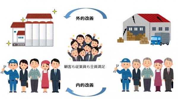 また事業の陳腐化・企業の老朽化を防ぐ為には時代に合ったサービスや商品をお客様へ供給する「外的改善」や業務を効率化し、適当な人員を配置する「内的改善」が必要になります。