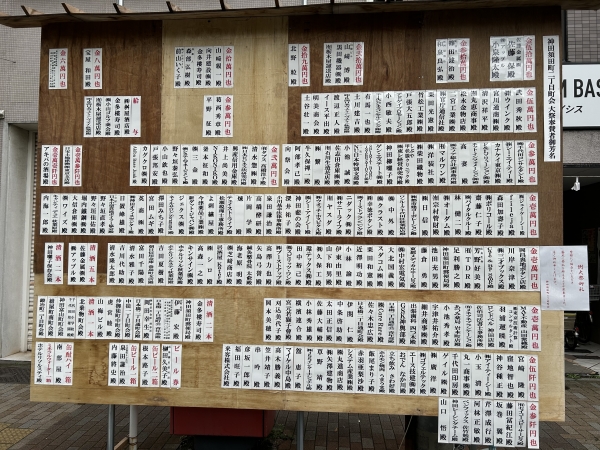 この時期になると神田祭の寄付金を奉納した企業や個人が神酒所のそばに掲示されていて、